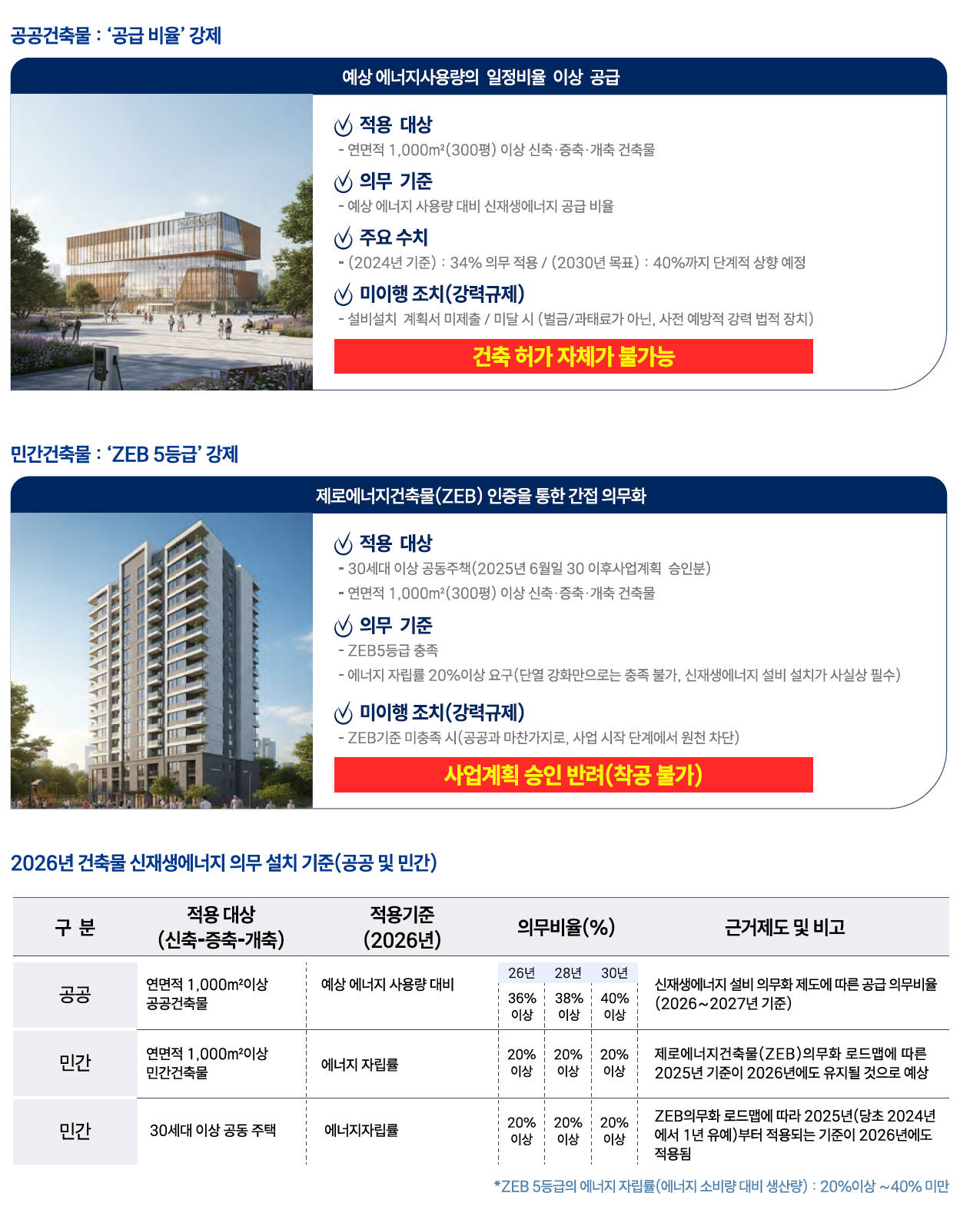 신축 건축물의 필수 관문 "신재생에너지 의무적용(공공:비율, 민간:ZEB 5등급)" 기준 미충족시 건축허가 및 사업승인 원천적으로 불가능
