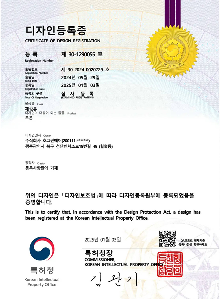 Patents and Certification Patent Certificate Authentication Certificate System and Method for Fault Prediction of a PEMFC (Proton Exchange Membrane Fuel Cell) 2025.12.15 Modular Power Supply Device Based on Hydrogen Fuel Cells with Parallel Connection Capability 2025.07.17 Hydrogen Fuel Cell Power Pack (Class 13) 2025.06.11 Drone (Class 12) 2025.01.03 Method and device for map display based on path direction 2015.07.16 Air supply device for fuel cells and fuel cell system including the same 2013.08.20 Wireless power receiver and its control method 2018.07.25 Wireless power transmitter and its control method 2018.07.25 High-temperature fuel cell system with improved heat utilization 2014.08.06 Fuel cell system with a combustion structure for expanding flammability limits 2014.10.28 Unmanned pesticide supply system 2017.11.01 Modular drone 2018.08.09 Control system for unmanned aircraft 2019.06.03 High-speed encryption method of video data for LTE-based swarm unmanned aviation system 2020.03.04 Emergency alert system using multiple drones 2020.01.03 Modular drone connection structure 2020.05.21 Ground control device for unmanned aircraft 2020.11.05 Unmanned aircraft black box system (PCT) 2021.01.21 Fuel cell power pack integrated with a hydrogen tank and drone equipped with it 2023.06.29 Drone equipped with an energy harvesting device 2023.01.26 Hydrogen power pack for drones with a temperature control system 2023.07.20 Drone station for automatic landing and hydrogen refueling of hydrogen drones 2023.07.20 Electric vehicle charging system using hydrogen fuel cells 2023.03.14 Vehicle charging system capable of hydrogen and electric charging 2023.03.14 Drone (Class 12) 2019.04.10 HogreenAir (Class 12) 2018.10.16 Keefly 2019.09.10