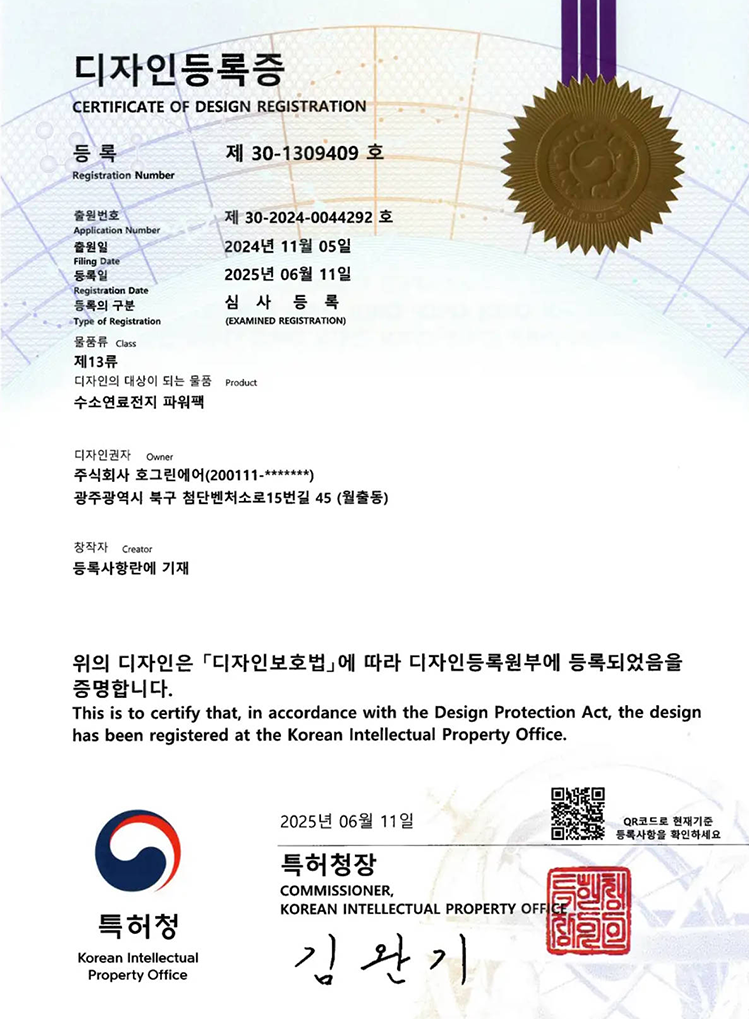 특허증 및 인증서 특허증 인증서 PEMFC의 고장 예지 시스템 및 방법 2025.12.15 병렬연결이 가능한 수소연료전지 기반 모듈형 전원공급장치 2025.07.17 제13류 수소연료전지 파워팩 2025.06.11 제12류 드론 2025.01.03 경로 방향에 기초한 맵 표시 방법 및 장치 2015.07.16 연료전지용 공기공급장치 및 이를 포함하는 연료전지시스템 2013.08.20 무선 전력 수신기 및 그 제어 방법 2018.07.25 무선 전력 송신기 및 그 제어 방법 2018.07.25 열 활용도가 향상된 고온형 연료전지 시스템 2014.08.06 연소기의 가연 한계 확장 구조를 갖는 연료전지시스템 2014.10.28 무인 농약 공급 시스템 2017.11.01 모듈형 드론 2018.08.09 무인 비행체의 조종 시스템 2019.06.03 LTE기반의 군집무인항공시스템의 영상데이터 고속암호화방법 2020.03.04 복수의 드론을 이용한 비상상황 경보시스템 2020.01.03 모듈형 드론 체결구조 2020.05.21 무인 항공기 지상 제어 장치 2020.11.05 무인 항공기 블랙박스 시스템 (PCT) 2021.01.21 수소탱크 일체형 연료전지 파워팩 및 이를 구비하는 드론 2023.06.29 에너지 하베스팅 장치를 구비한 드론 2023.01.26 온도조절 시스템이 구비된 드론용 수소파워팩 2023.07.20 수소드론의 자동 착륙 및 수소충전을 위한 드론스테이션 2023.07.20 수소연료전지를 이용한 전기 차량 충전 시스템 2023.03.14 수소 및 전기 충전이 가능한 차량용 충전 시스템 2023.03.14 드론 (12류) 2019.04.10 호그린에어 (12류) 2018.10.16 Keefly 2019.09.10